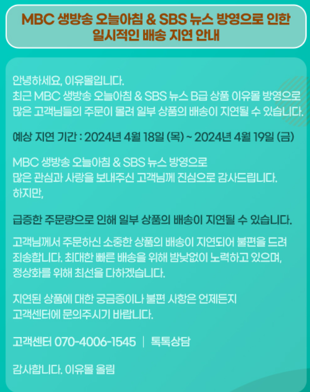 - 이유몰은 대부분의 상품을 2~3일 내에 배송합니다.