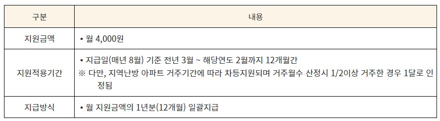 - 지역 난방비 감면 :세대별 주민등록표상 세대주와의 관계가 "자(子)"가 3명 이상 또는 "손(孫)" 이 3명 이상으로 표시된 다자녀가구(위탁아동을 포함함)는 월 4,000원의 난방비 요금을 지원받을 수 있습니다.